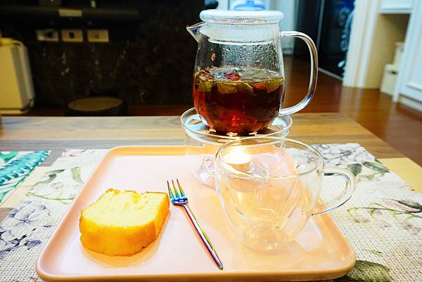 最近感覺自己有點水腫,所以點了這份玫瑰荷葉茶,旁邊是香甜的磅蛋糕