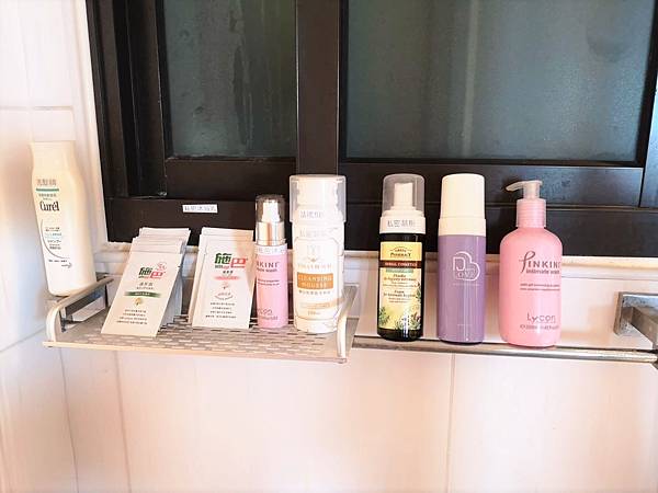 除了乾濕分離衛浴設備以外,還有各式各樣的醫美保養品試用包以及各種拋棄式備品如衛生棉、浴帽等可以使用